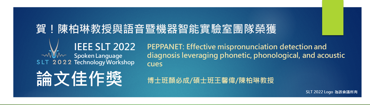 本系陳柏琳老師指導研究生榮獲 IEEE SLT 學術會議之論文佳作獎!
