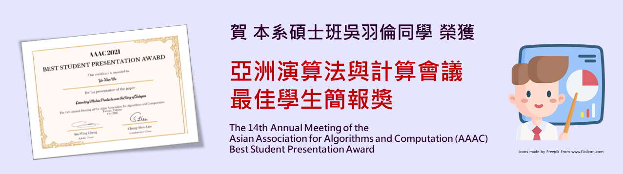 本系王弘倫老師指導碩士班吳羽倫同學於亞洲演算法與計算會議榮獲最佳學生簡報獎!