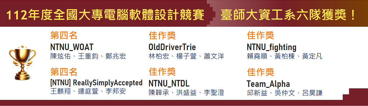 本系同學參加全國大專電腦軟體競賽,六隊全數獲獎,獲獎數全國前五。